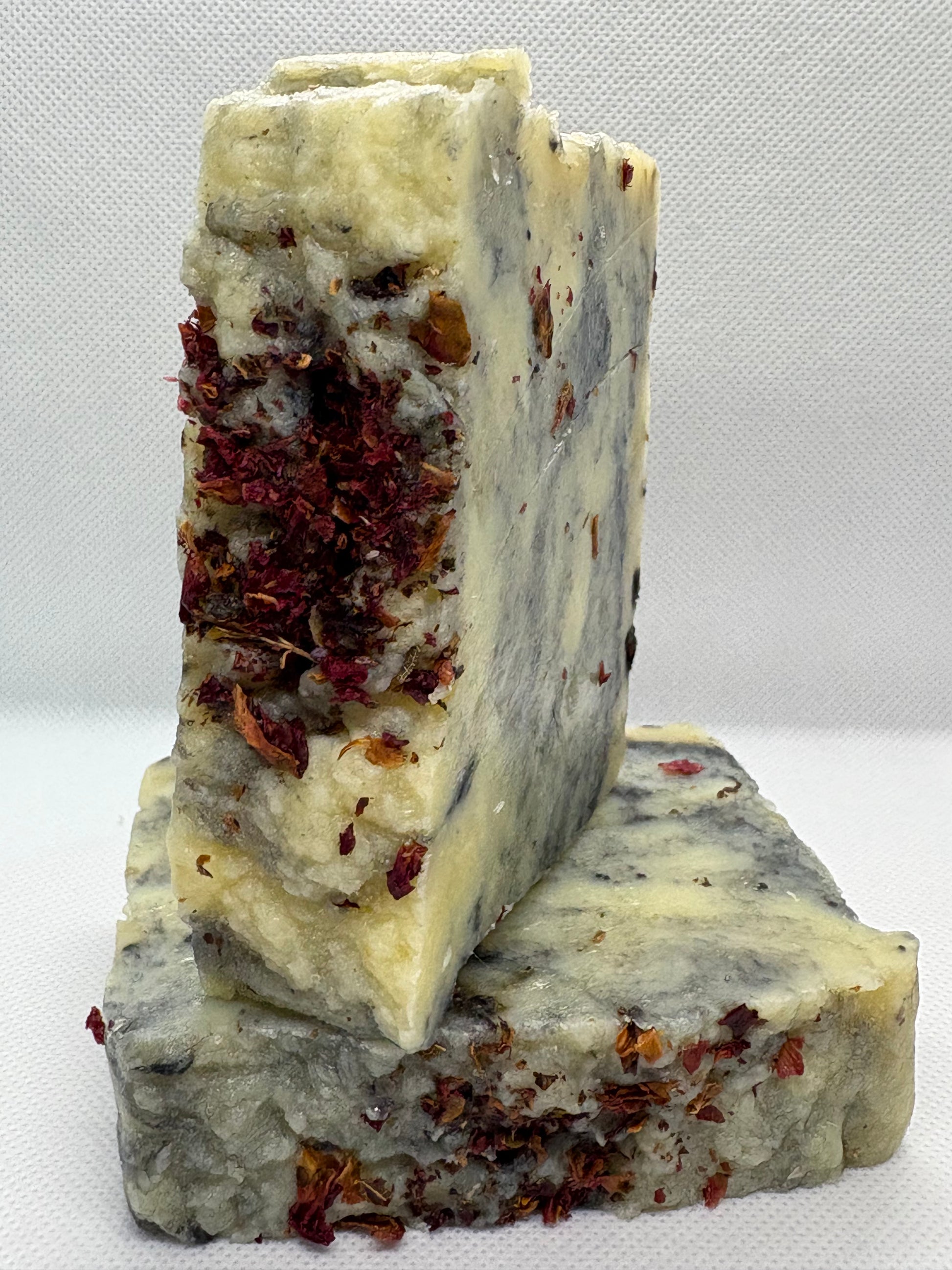 Ingredients: Olive Oil, Palm Oil, Castor Oil, Shea Butter, Sodium Hydroxide, Activated Charcoal, Benidite Clay, Rose Petals, Poppy Seeds, Lavender Essential Oil, Rose Essential Oil